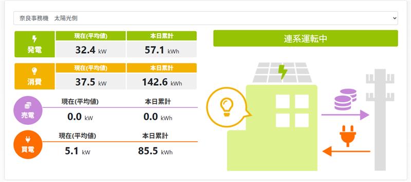 また、今後は会社の1階に設置しているモニターに発電や消費電力の状況を表示する計画もあります。社員や来社されたお客様にも、奈良事務機がどのようにエネルギーを活用しているかを知っていただけるようにすることで、より身近に環境への取り組みを感じてもらえたらと考えています。