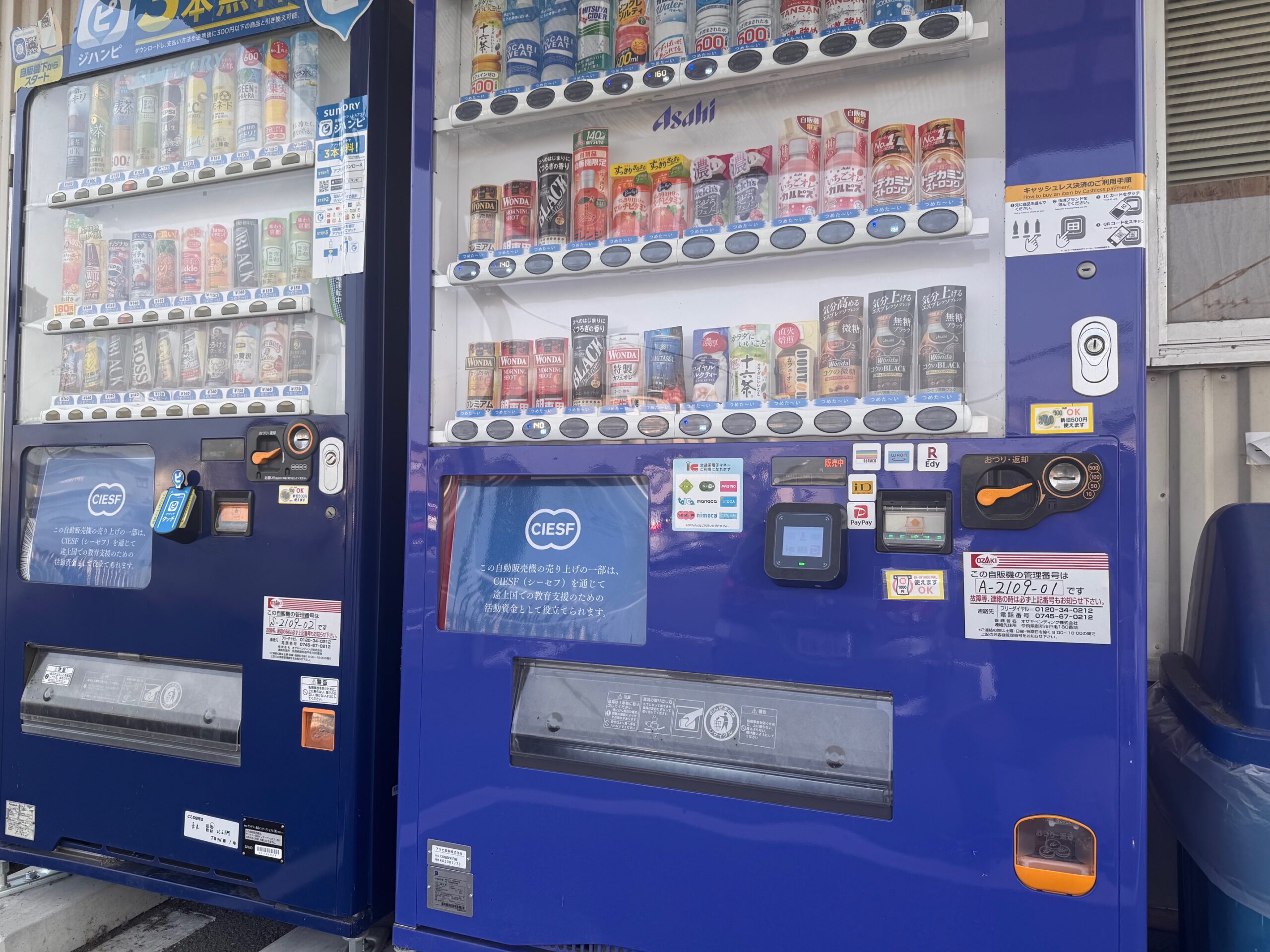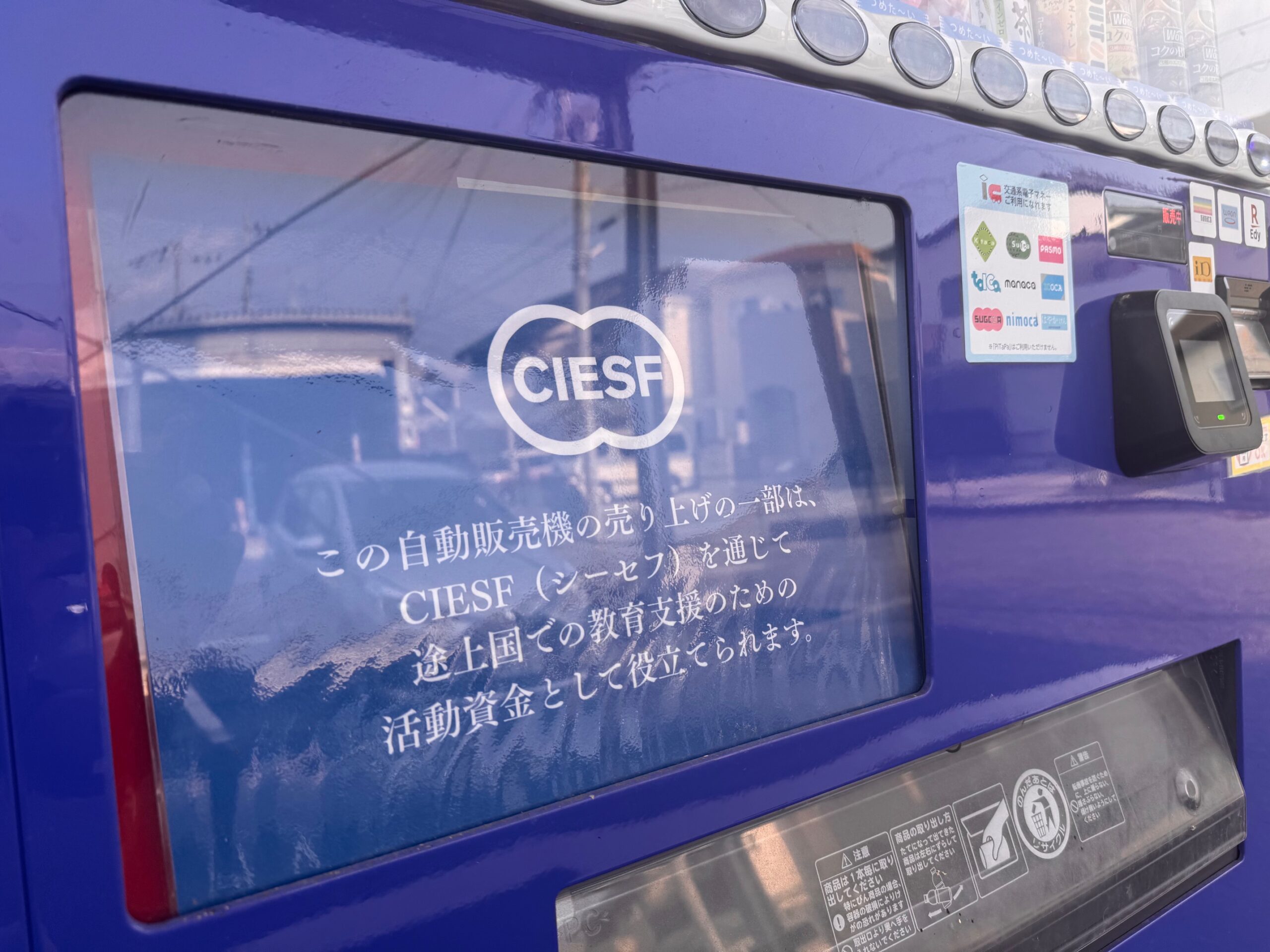 この理念に共感し、奈良事務機でも独自の形で支援を行っています。その一例が、社内外に設置している自動販売機。売上の一部をCIESFに寄付し、遠く離れた国の子どもたちや教育現場を応援しているのです。